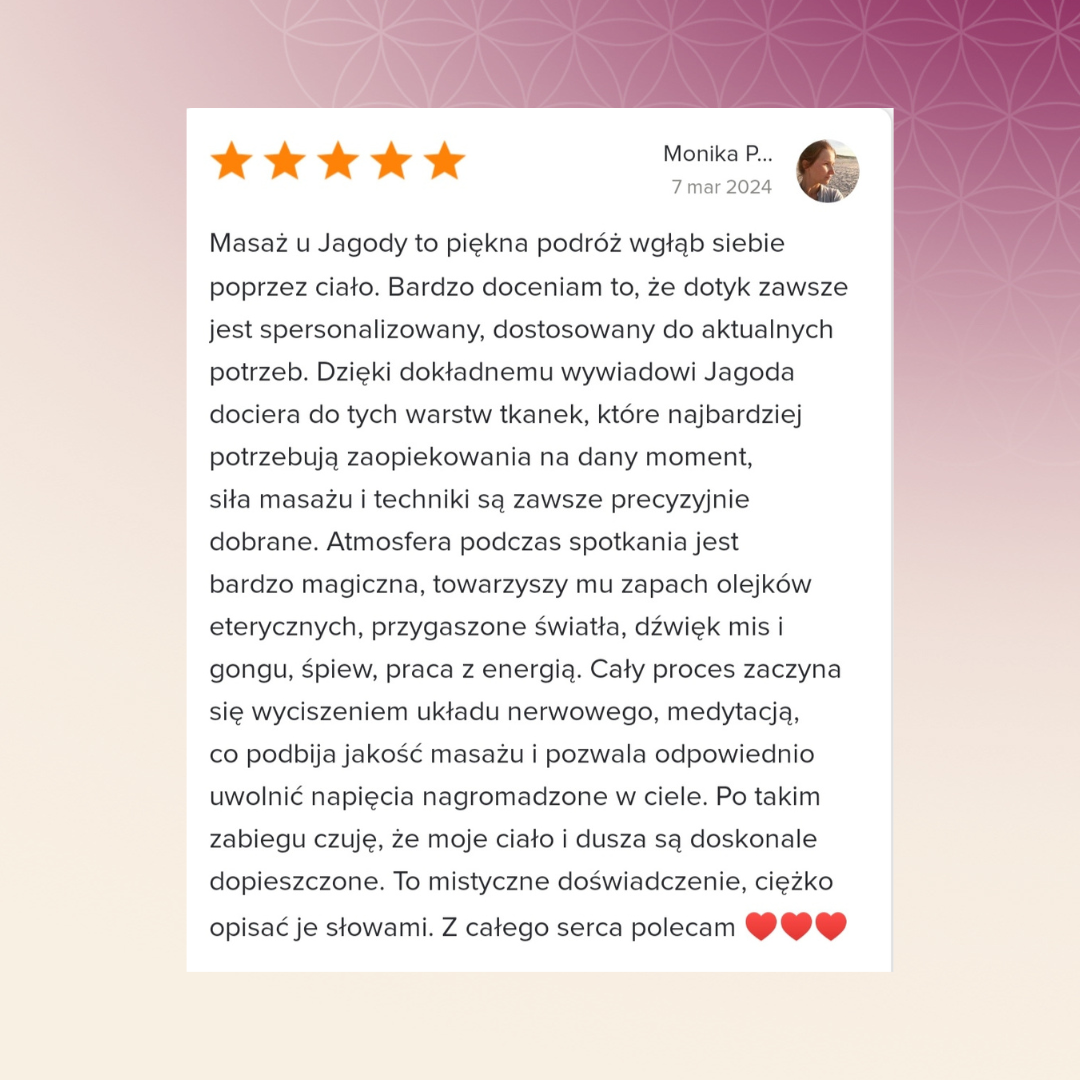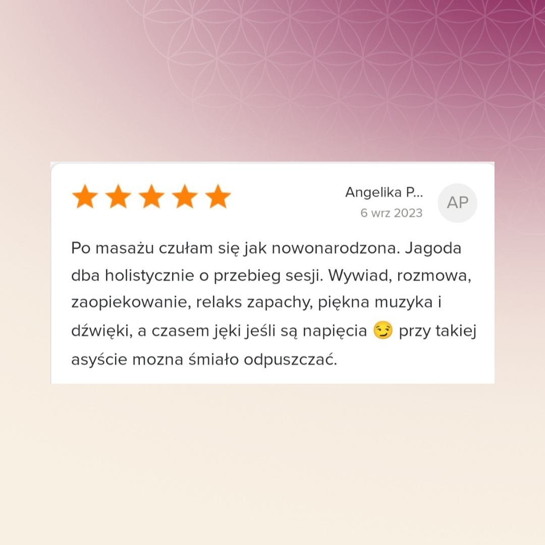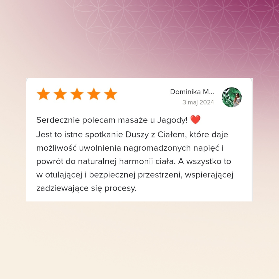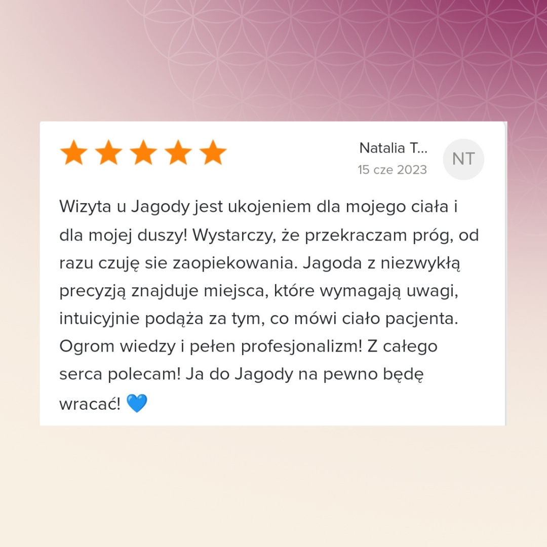 Wizyta u Jagody jest ukojeniem dla mojego ciała i dla mojej duszy! Wystarczy, że przekraczam próg, od razu czuję sie zaopiekowania. Jagoda z niezwykłą precyzją znajduje miejsca, które wymagają uwagi, intuicyjnie podąża za tym, co mówi ciało pacjenta. Ogrom wiedzy i pełen profesjonalizm! Z całego serca polecam! Ja do Jagody na pewno będę wracać!