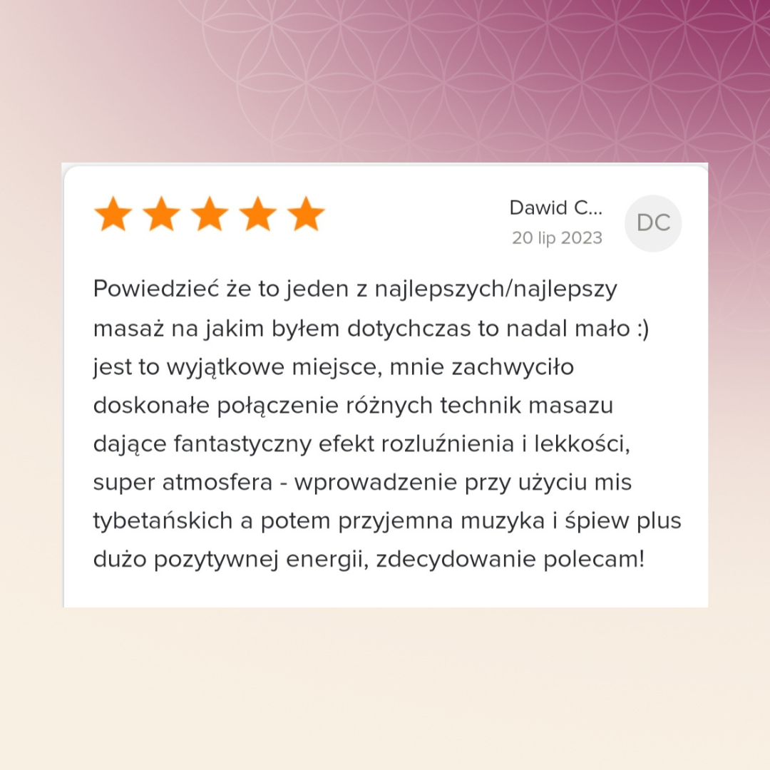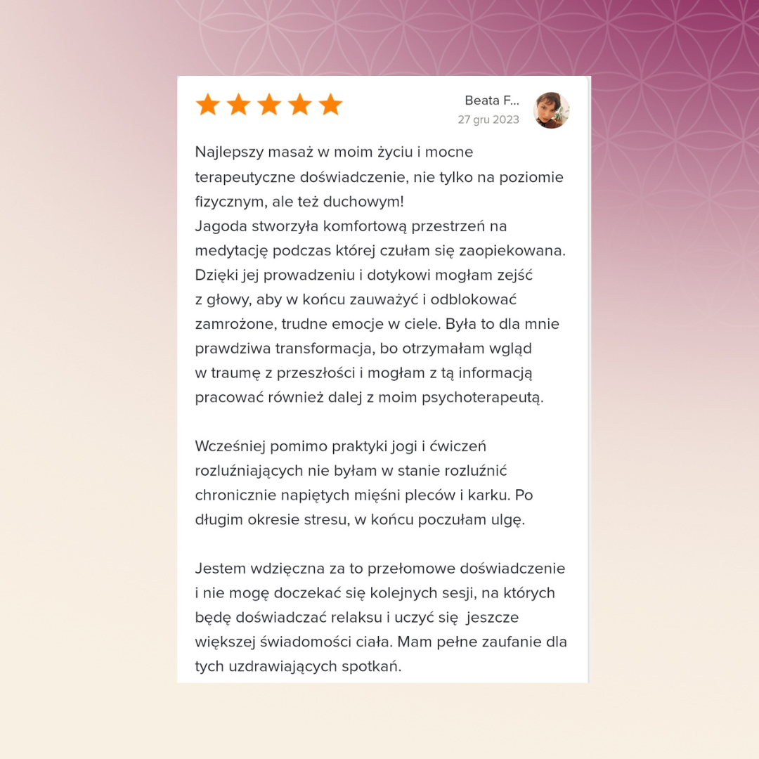Kiedy zaczynałem współpracę z Jagodą nie miałem świadomości swojego ciała ani emocji w nim siedzących. Czułem się odłączony od swojego ciała i duszy. Teraz po wielu miesiącach pracy czuje się bardziej pewny siebie, swobodniej między ludźmi. Kończąc współpracę z Jagodą czuje, że mogę wszystko i że mam ogrom zasobów do radzenia sobie w trudnych momentach. Transformacja na poziomie ciała : nauczyłem się napinać mięśnie pośladkowe i około łopatkowe, w dodatku wyczułem swoje mięśnie brzucha. Transformacja na poziomie emocji - jestem świadomy że emocje są nietrwałe jeśli się je przyjmuje. Wiem jak dużo emocji siedzi w moim ciele. Zdecydowałem się na współpracę z Tobą, żeby spróbować nowych metod masażu. Doceniam Twoja szczerość i holistyczne podejście. Mam świadomość tego jak krótki jest dzień i wykorzystuje każdą chwilę jak najefektywniej. Jednocześnie nauczyłem się odpuszczać, kiedy nie mam siły na zrobienie wszystkiego, co zaplanowałem. Warsztaty sprawiły że mniej się koncentruje na sobie i przejmuje opinią innych. Poleciłbym współpracę z Tobą każdemu kto próbował różnych metod terapii bezskutecznie.
